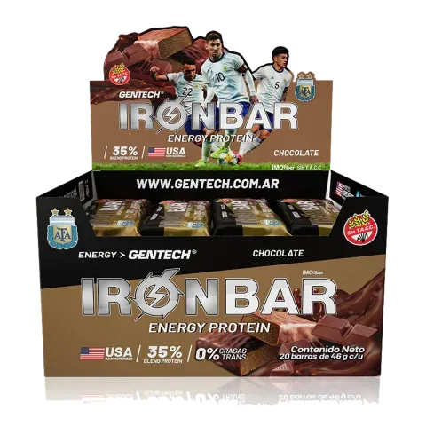 Barra proteica a base de proteínas de suero lácteo e hidratos de carbono, con alta concentración de aminoácidos. La barra proteica Iron Bar de Gentech, te ayuda con tu desempeño y crecimiento muscular durante el entrenamiento. Las Iron Bar promueven la recuperación muscular y la resistencia, ideales para respaldar tu ejercicio y desarrollo. Probalas!